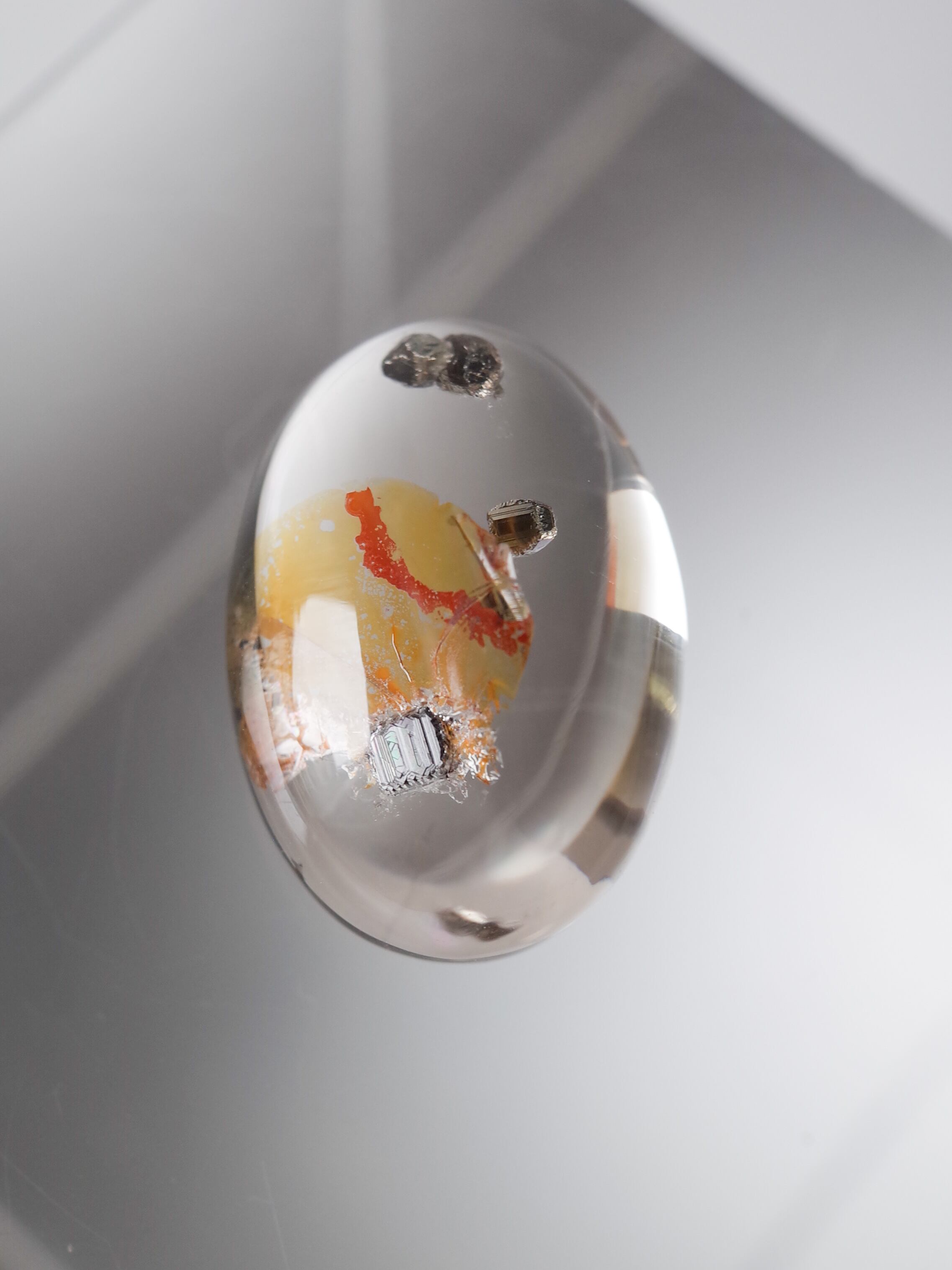 ギリシャ語で「パイ」は、「火」を意味し、昔は火打ち石として使用されていた歴史があります。パイライトは硫化鉱物のため、原石の状態で保存するとサビやすいのですが、水晶の中に閉じ込められているのでずっと綺麗な結晶を楽しめることができます。