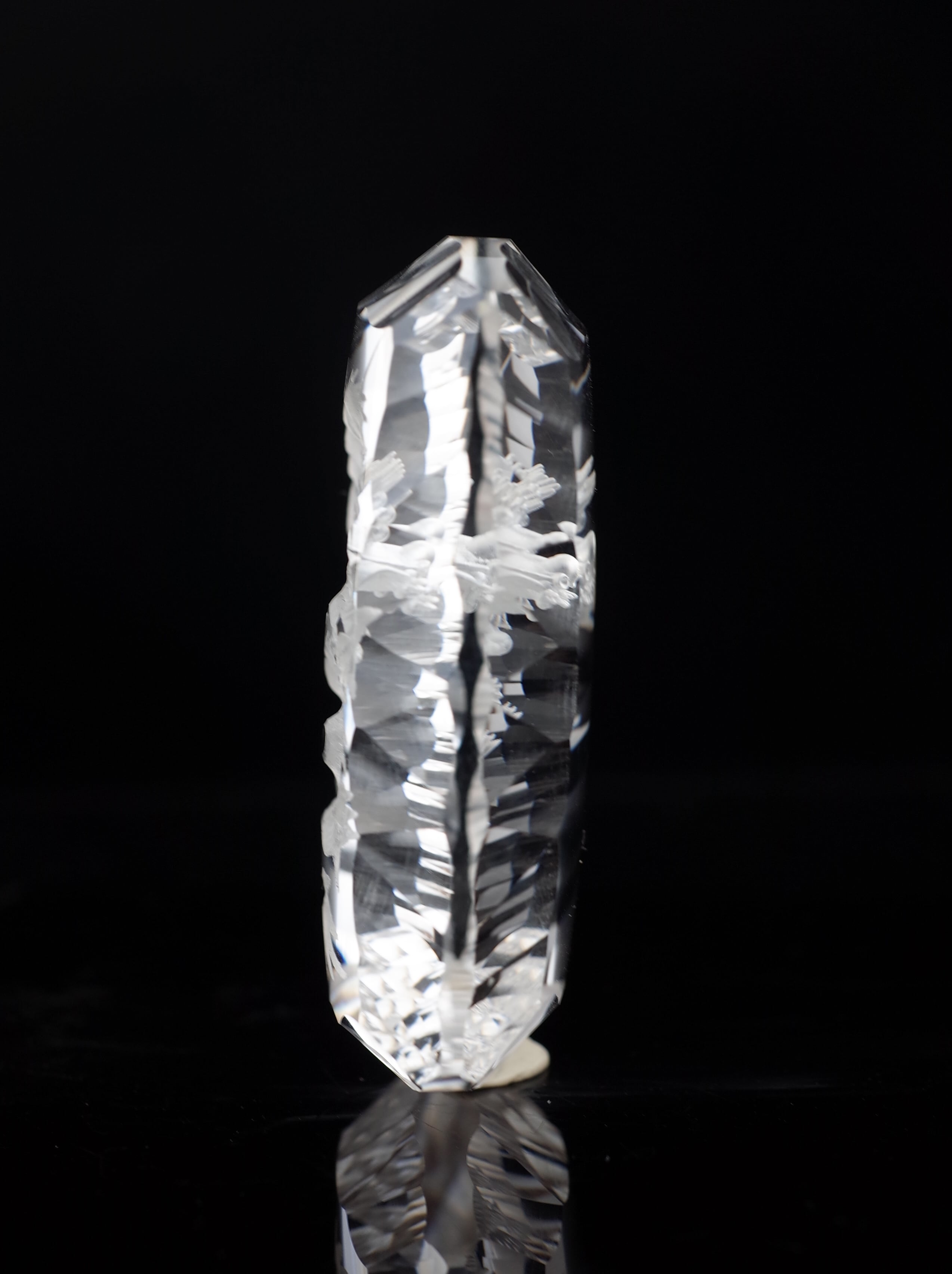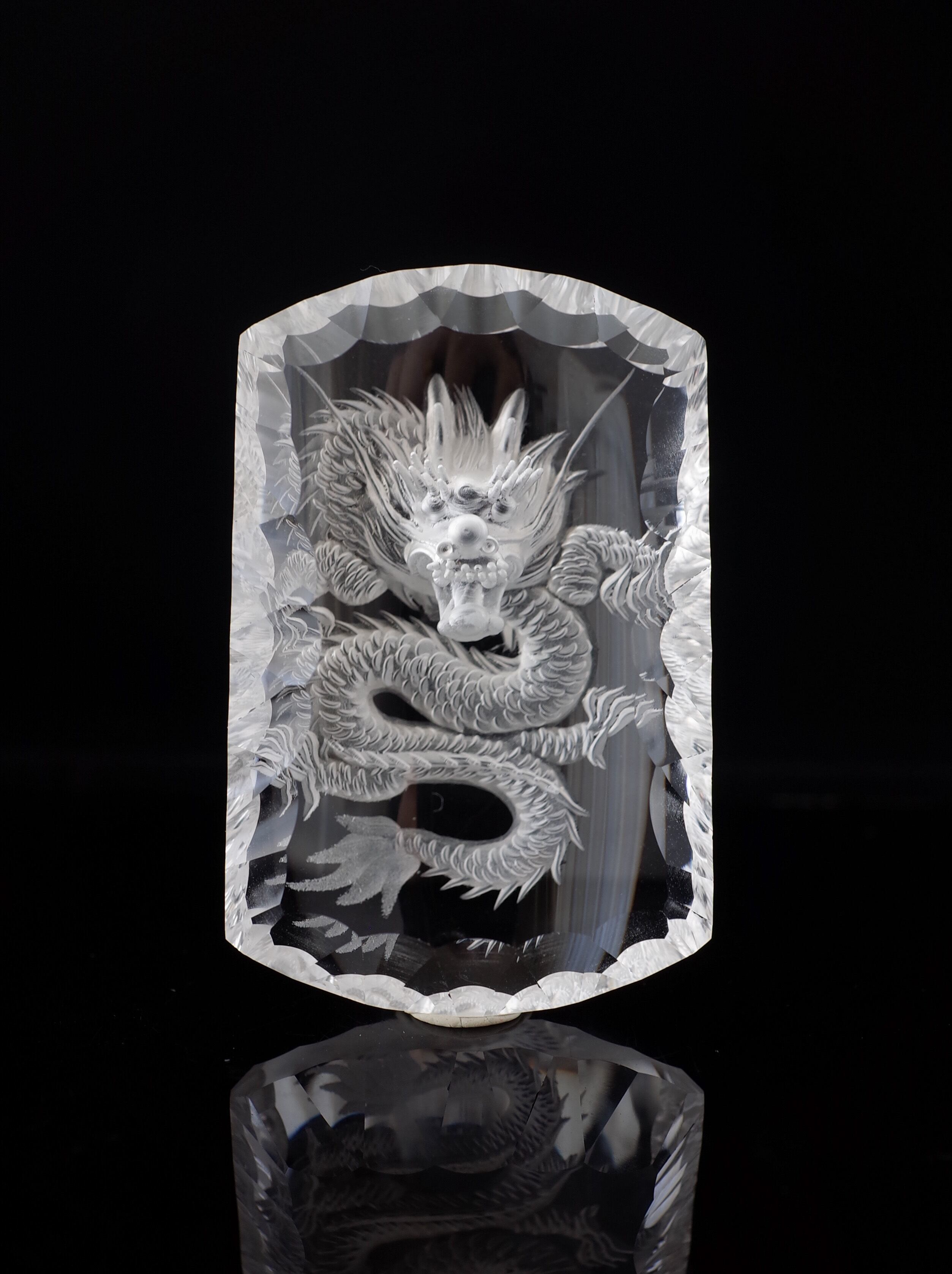 透明度の高い水晶に裏側から龍を彫り入れた芸術性の高い一点です。バックカービングは表の図案を裏側でフリーハンドで描いていく、熟練した勘と技術が必要な彫刻です。機械彫りが多くなっている中で、正真正銘の40年培った手彫りの技が成せる素晴らしい仕上がりです。