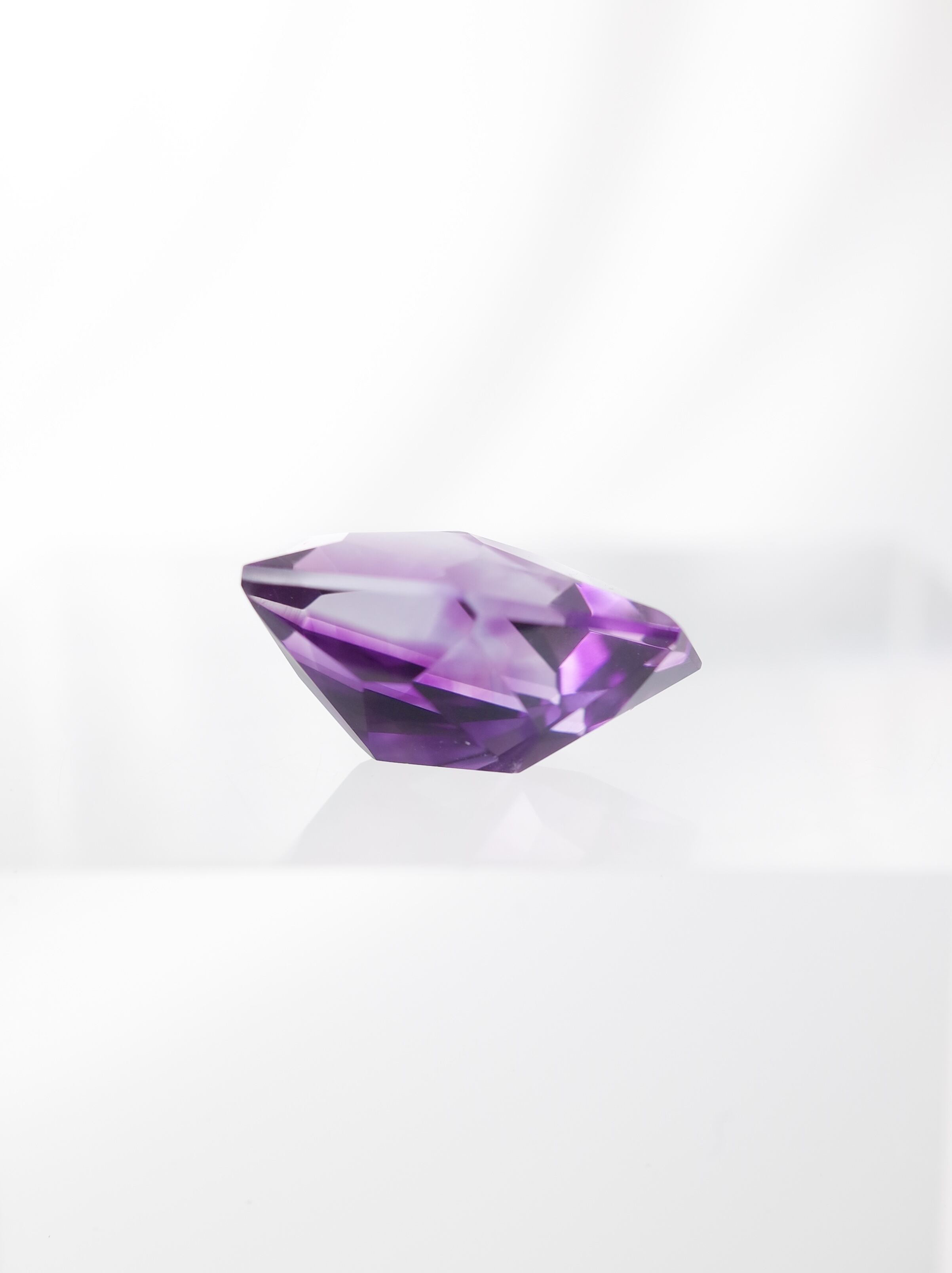 ランダムなカットが魅力のこちらのアメシストは、日本で研磨されたデッドストック品です。バレル研磨という方法で仕上げられているため、ファセットエッジがやや甘く、シャープになりすぎない優しい仕上がりが特徴です。とてもクリアでインクルージョンの無いルースですので、カットの魅力を存分に楽しんでいただけます。