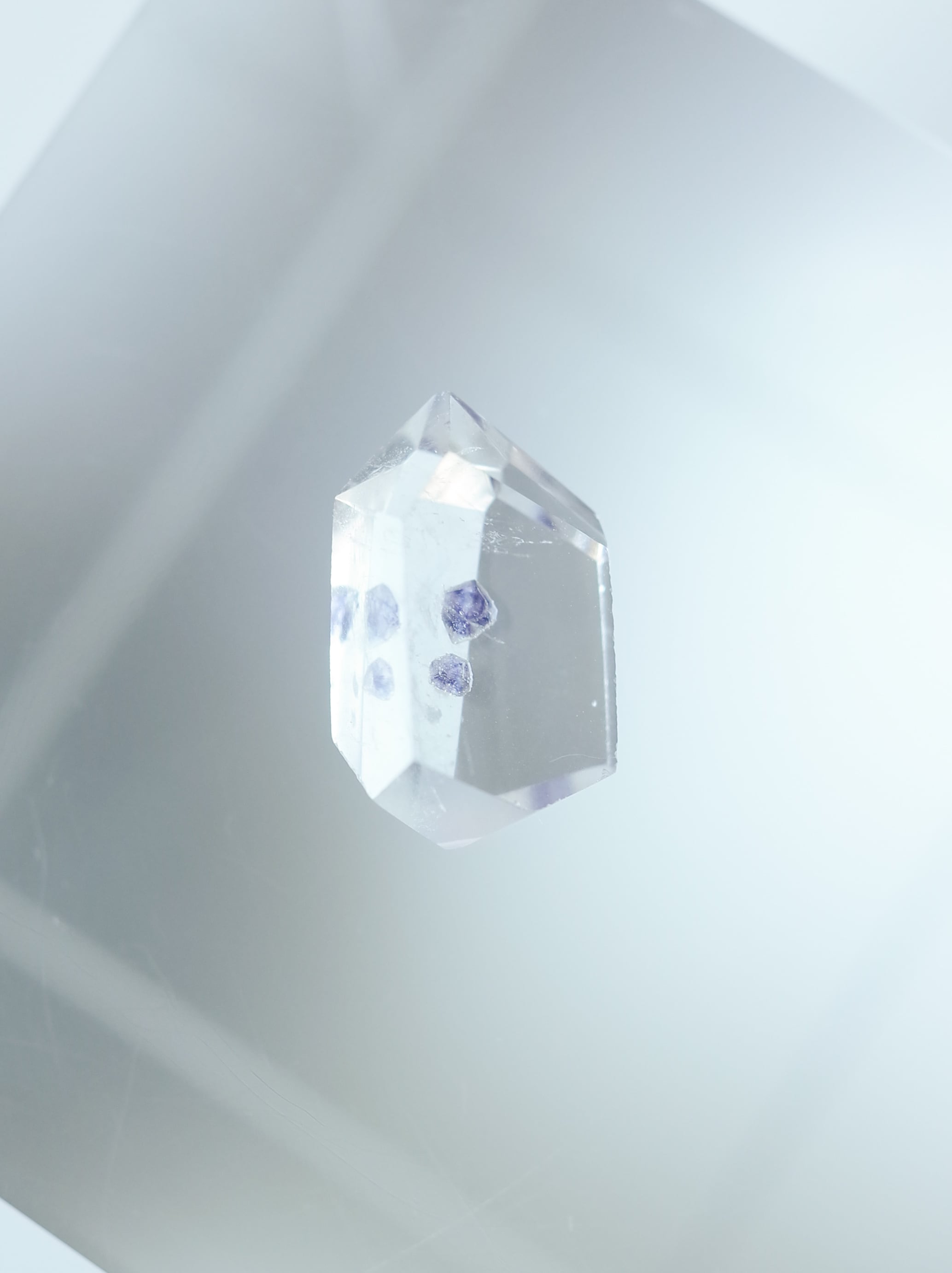 淡いブルーのフローライトの結晶を内包した「フローライトインクォーツ」。他にはないフローライトらしい独特の色合いと、綺麗な結晶の形をお楽しみください。