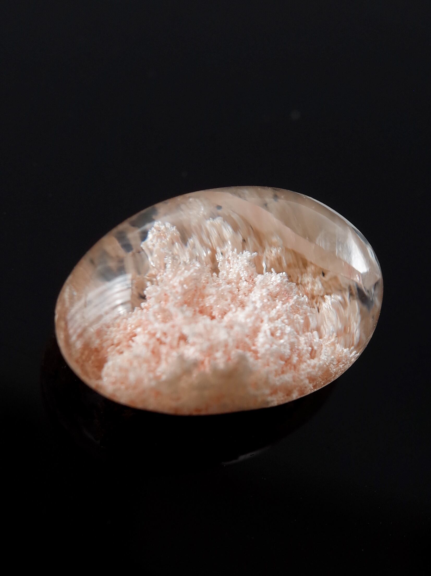 このタイプの石は底の方にイングルージョンを配置しカボションにすることで、水晶のレンズ効果により内包物を拡大させるようにカットされたものが多く、裏面は綺麗に研磨できないものや、充填処理が施されている石も多くございます。ご購入前に最後の裏面の写真もご確認ください。またインクルージョンクォーツは内包物を含んで研磨してあるため面傷の出やすいタイプのルースです。目立つキズは避けていますが、ごく小さなものに関して殆どのルースに入っています。見た目の美しさとバランスをみて判断していますので石の特徴としてお考えください。