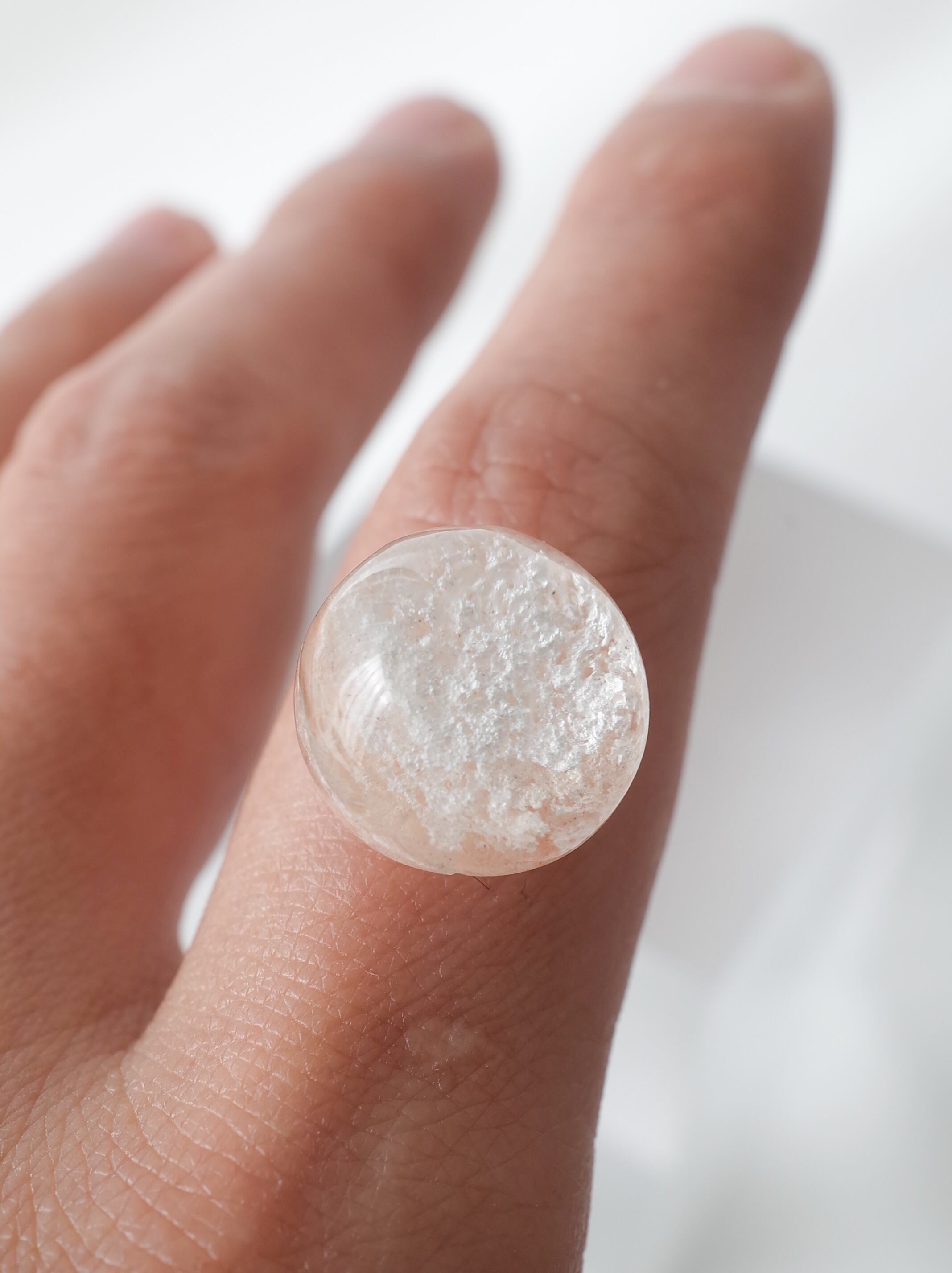 SELSHA の顔ともなっている『ホワイトガーデンクォーツ』中に内包された白雲母が雪のようだったり、空に浮かぶ雲のようだったり、様々な景色を楽しませてくれます。こちらは真っ白ではなく、少し色味の混じった春らしいタイプです。