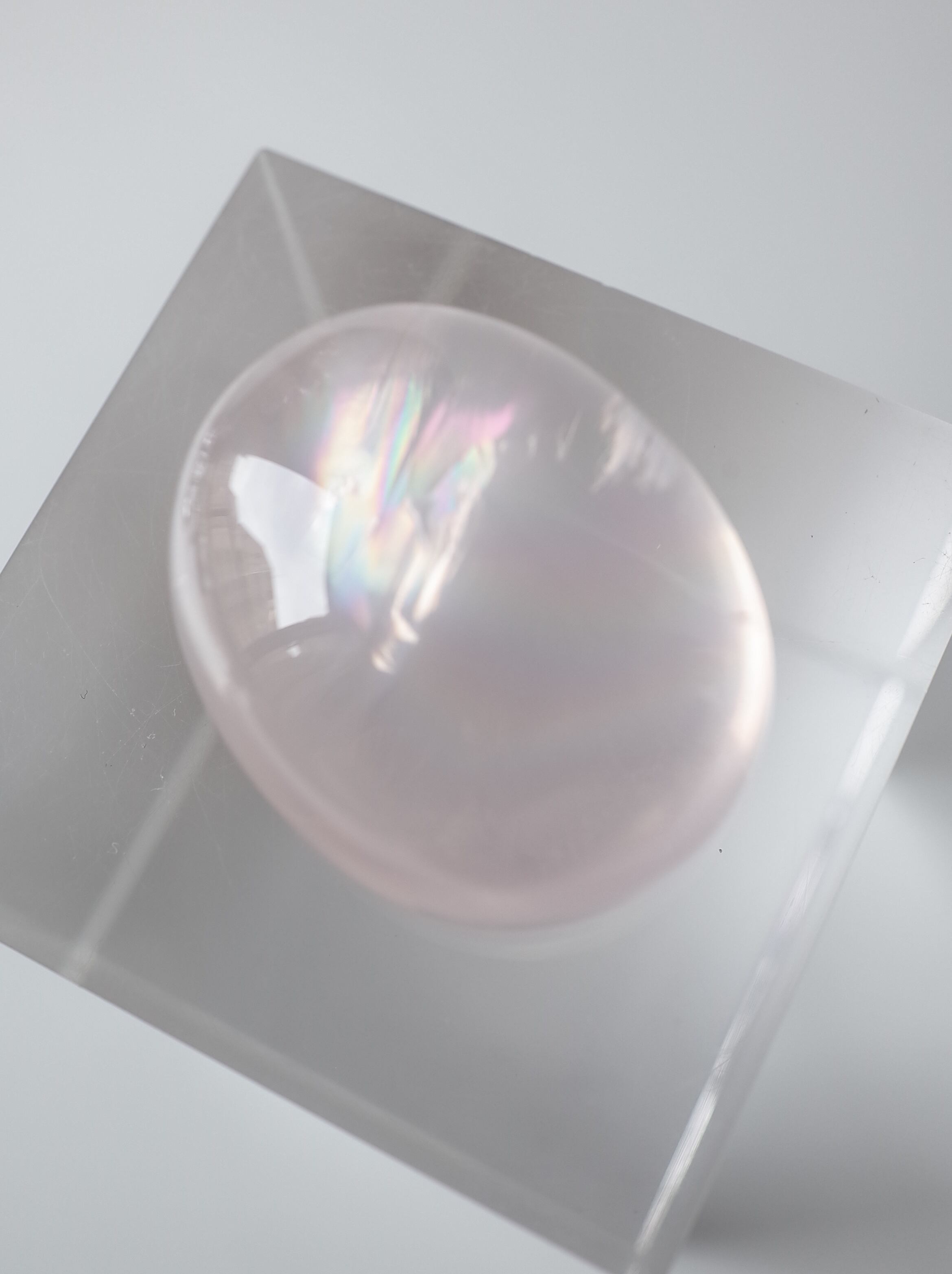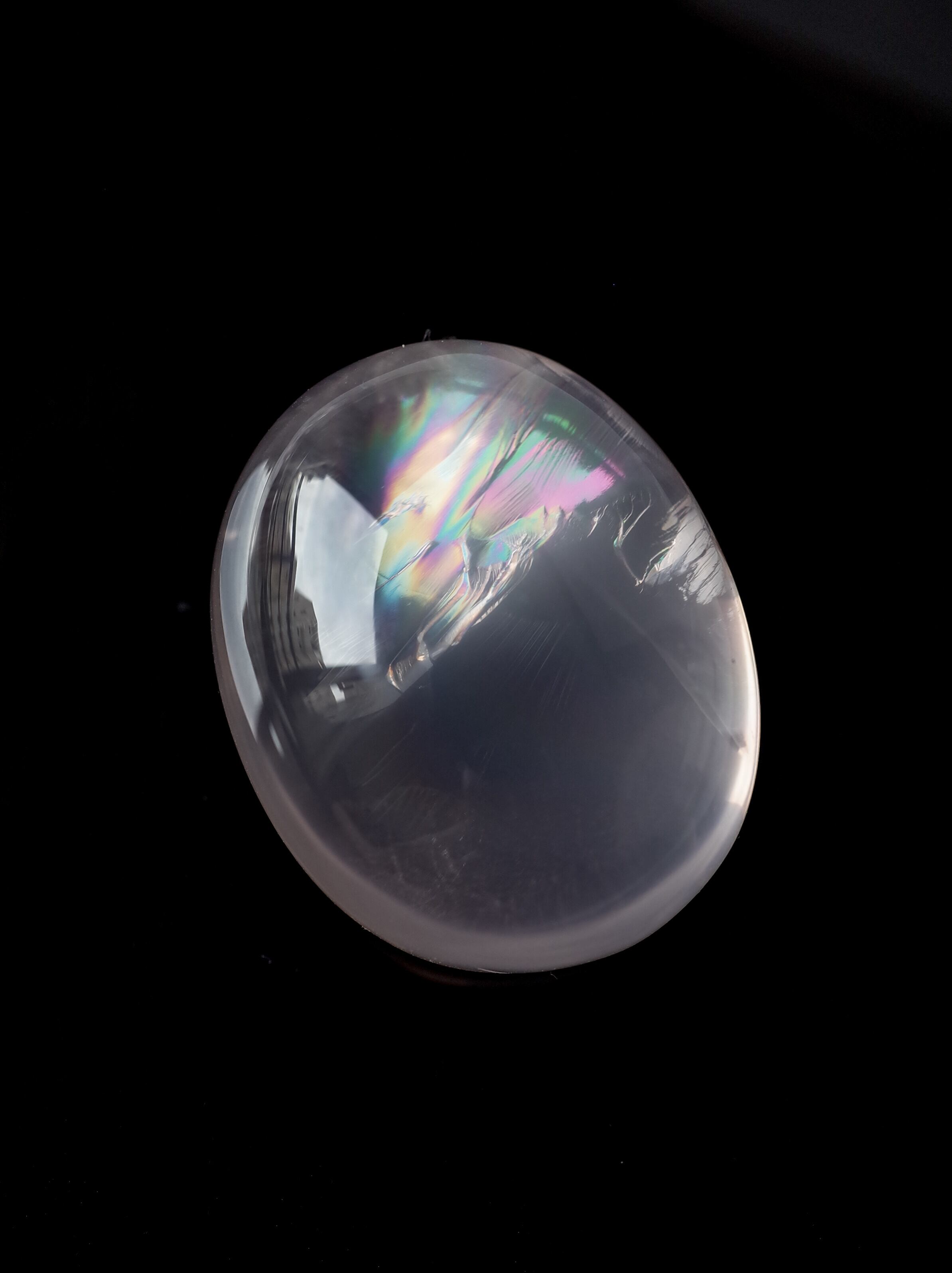 水晶で見られるこの現象は内部に薄い層があってこそのものですので、クラックのある原石から研磨しています。その為ひび割れの一部が表面へ達している場合が多くありますのでご理解の上ご購入ください。