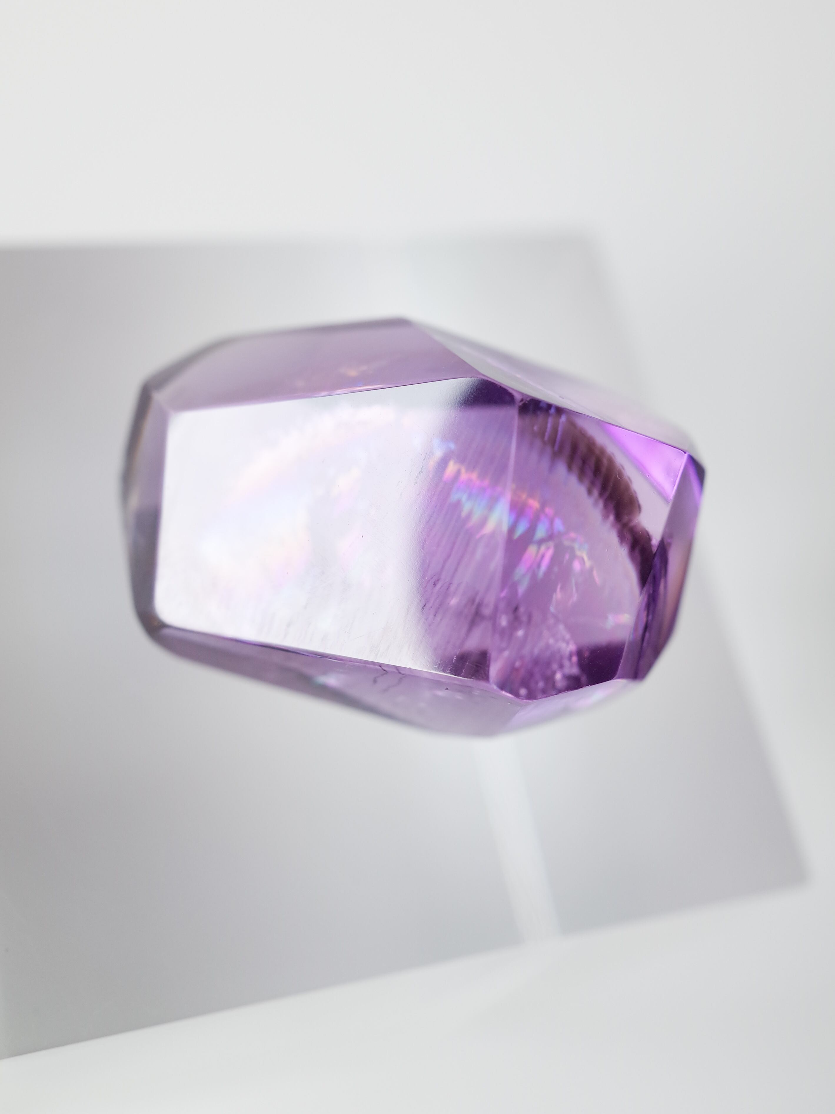 水晶で見られるこの現象は内部に薄い層があってこそのものですので、クラックのある原石から研磨しています。その為ひび割れの一部が表面へ達している場合が多くありますのでご理解の上ご購入ください。