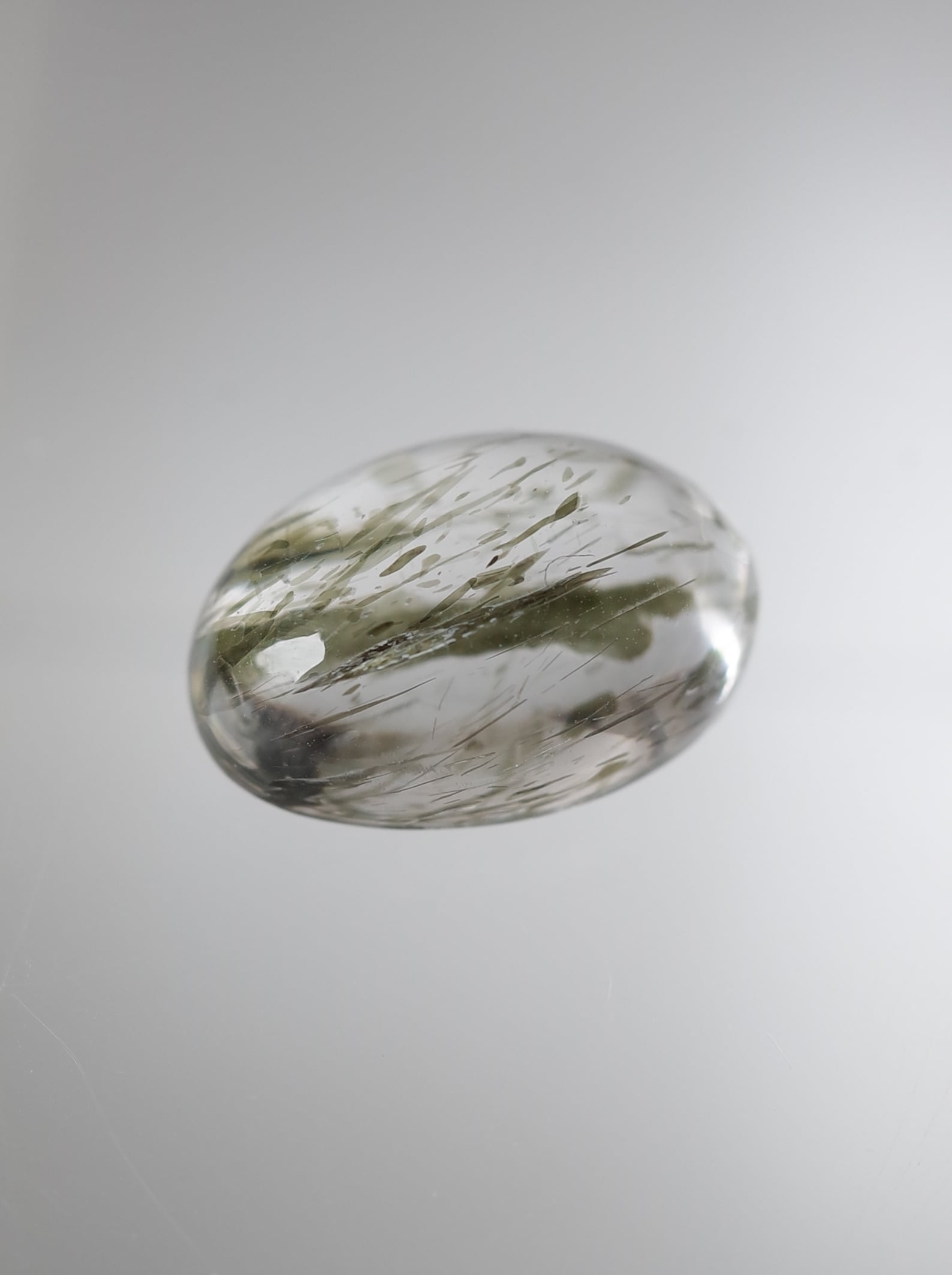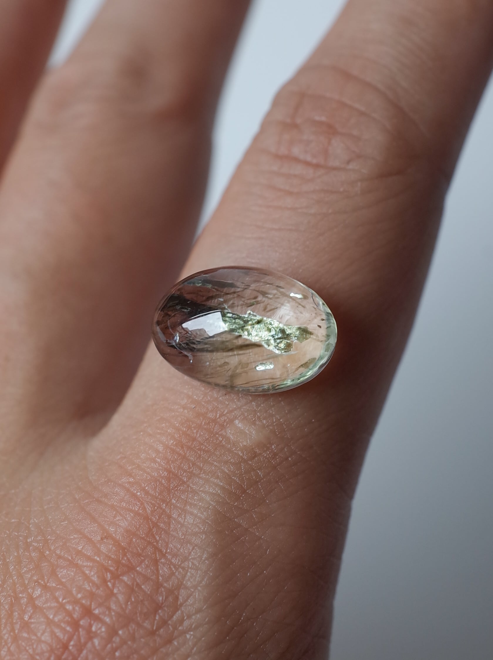 光を透かすような薄いグリーンのインクルージョンが爽やかなバイオタイトインクォーツ。バイオタイトは雲母の一種です。