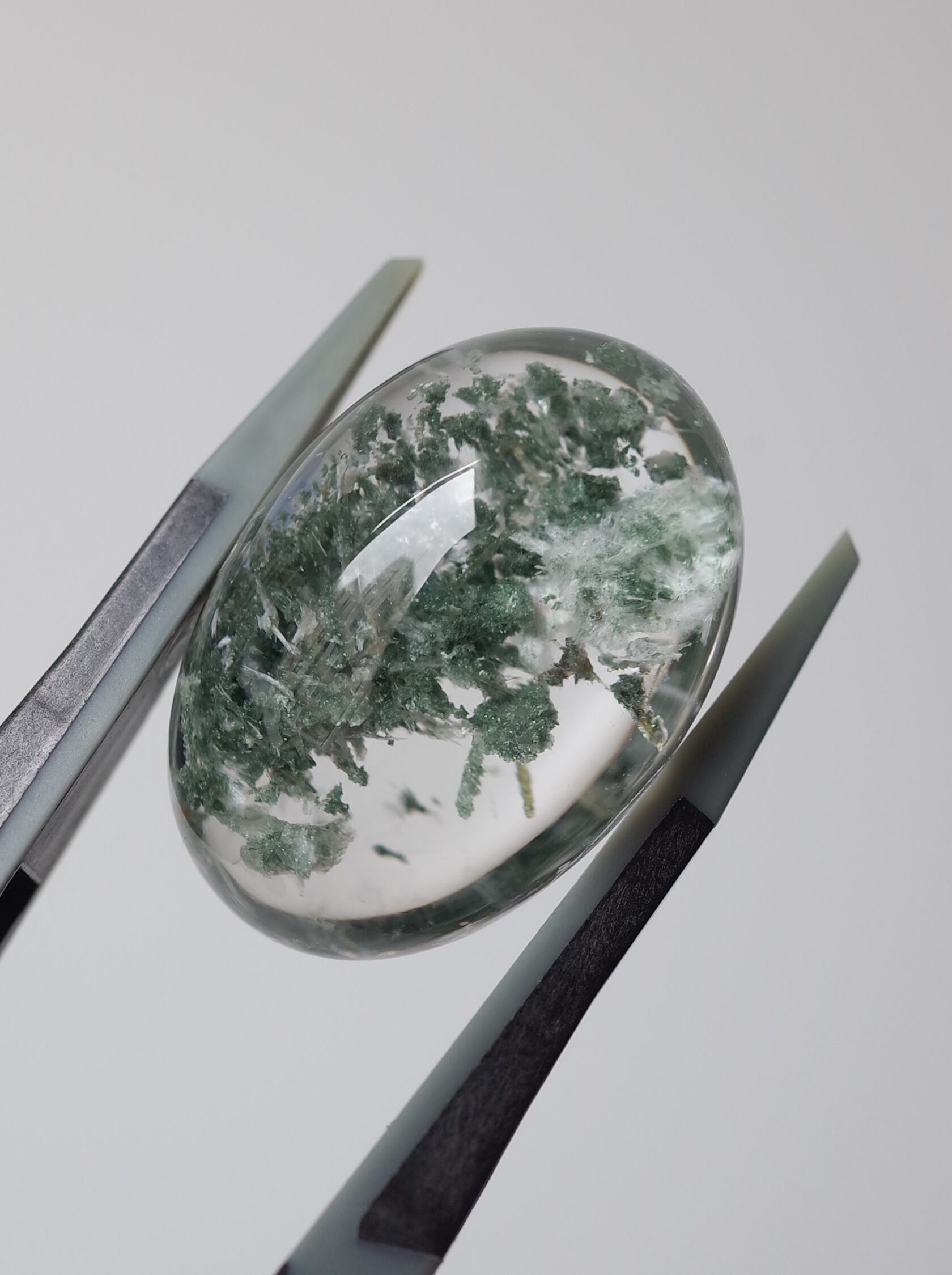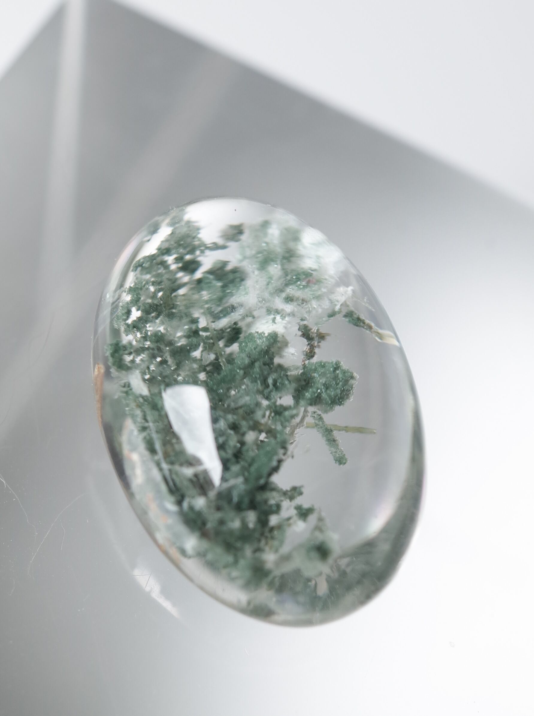 “ガーデンクォーツ”という呼び名は外見の様子からつけられたトレードネーム。もともとは主にクローライト/ 緑泥石が内包されたもの (海外ではLodoliteとも呼ばれている) を指していましたが、 近年では他のインクルージョンのものを含め広い範囲で使われるようになっています。