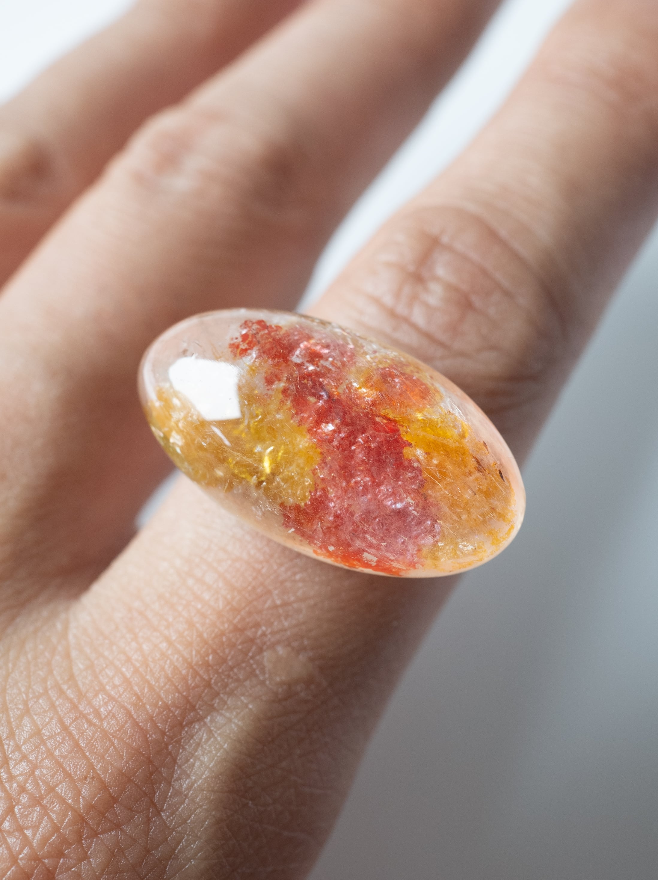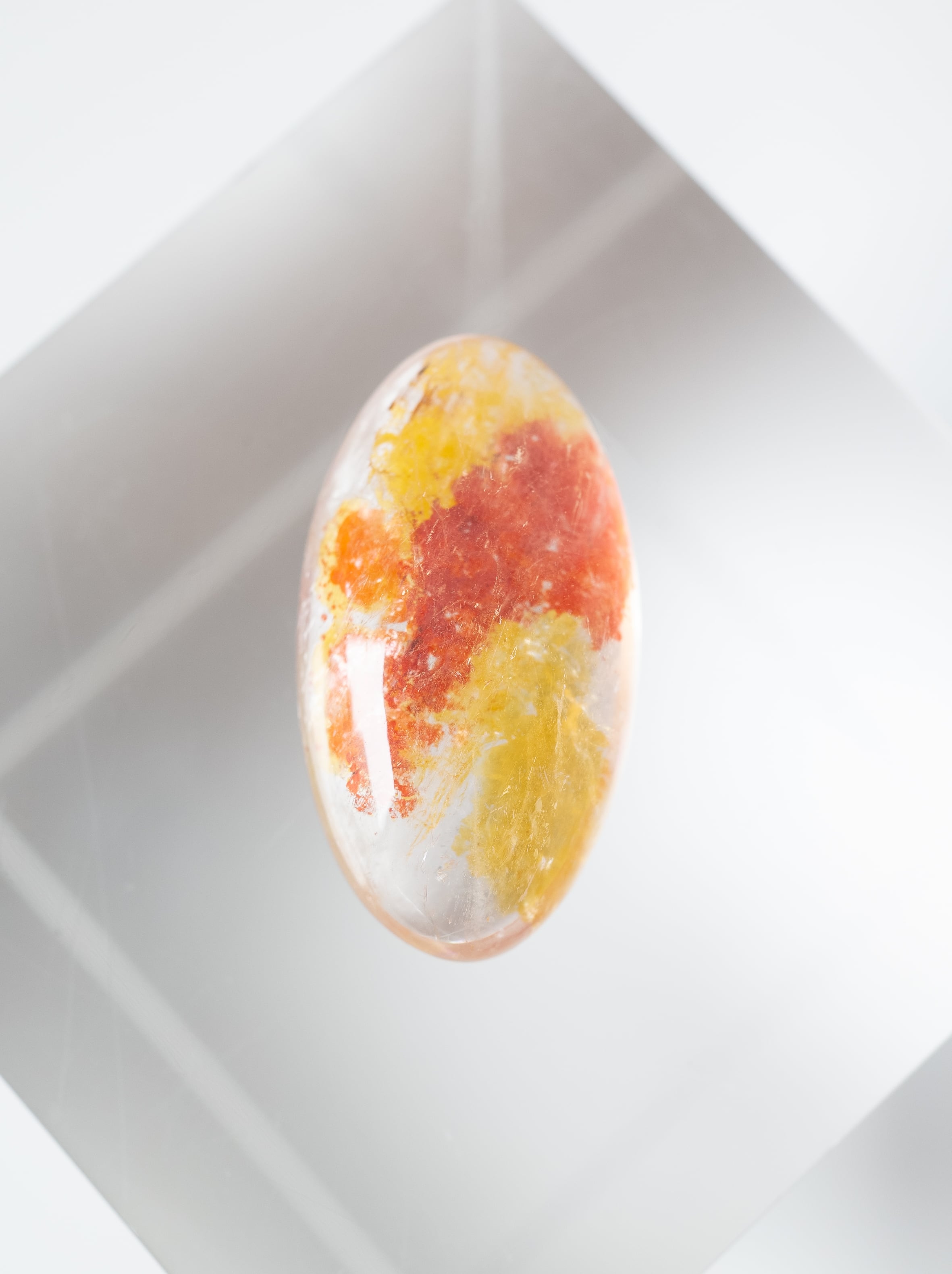 赤いヘマタイトと、黄色いライモナイト(リモナイト) を内包したクォーツです。
