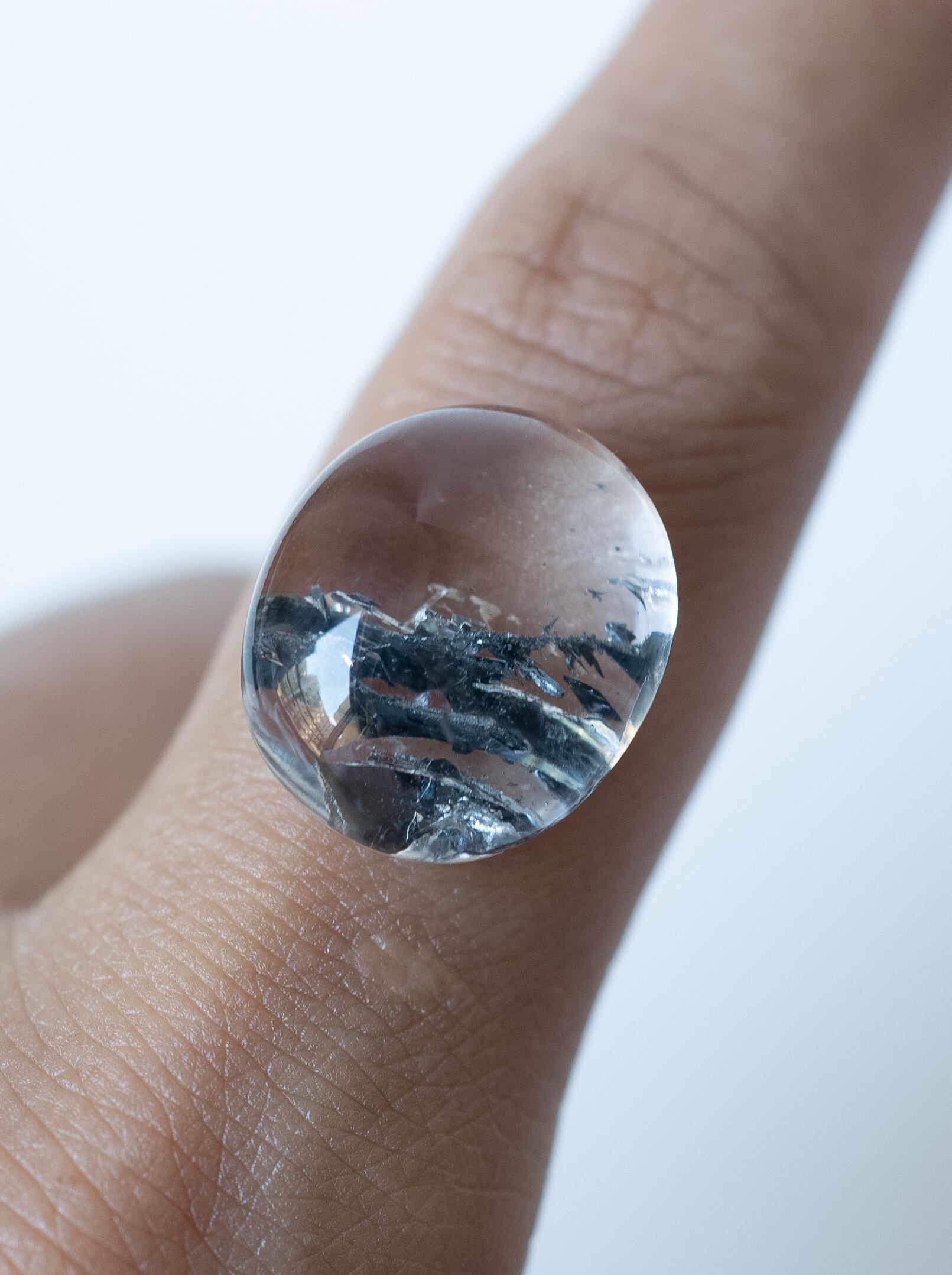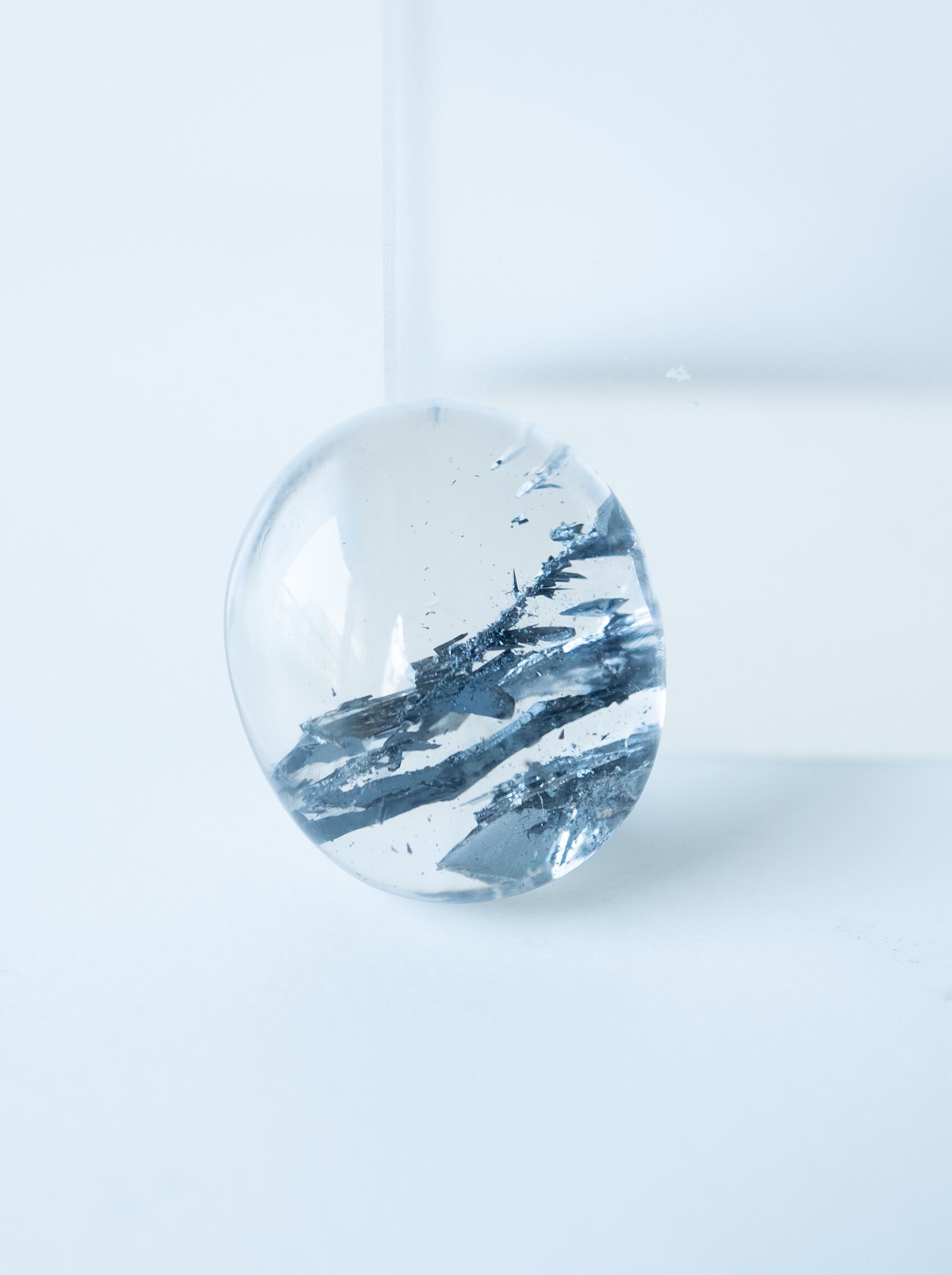 スティブナイトインクォーツ(Stibnite in Quartz)は、石英の中に針状や柱状のスティブナイト(輝安鉱)結晶が含まれるクォーツです。黒銀色の光沢と、剣のような結晶の形状が特徴的で、産出地域が限られるため、流通量も非常に少ない天然石です。