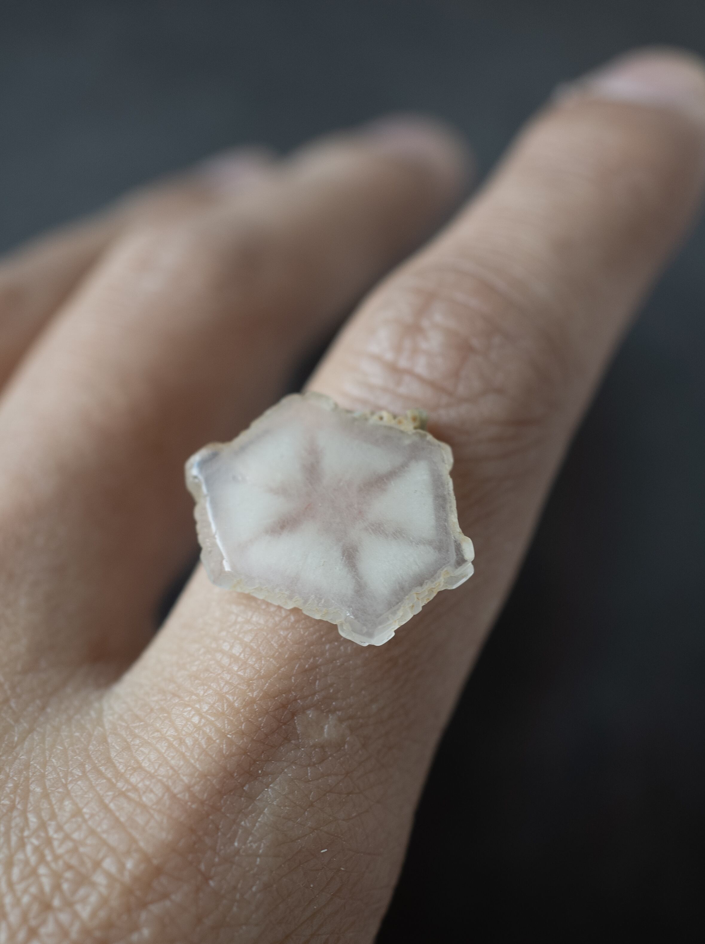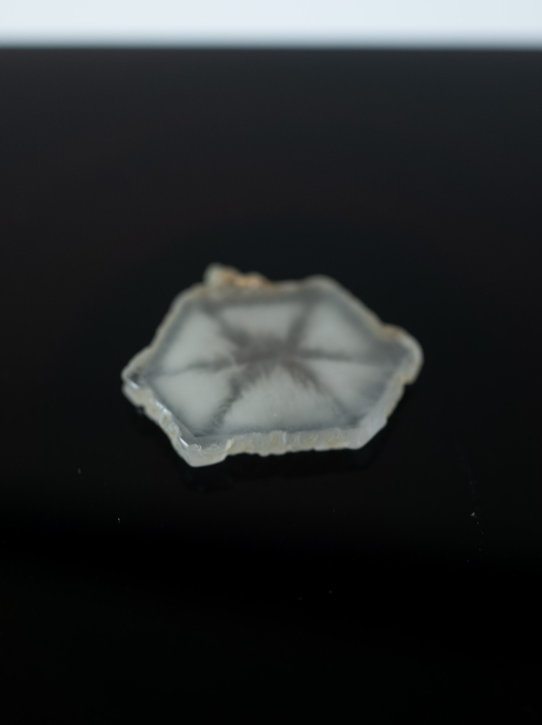『トラピッチェクォーツ』とは、6条の放射模様が見られる水晶の結晶を、模様が分かる方向にスライスしたクォーツです。
