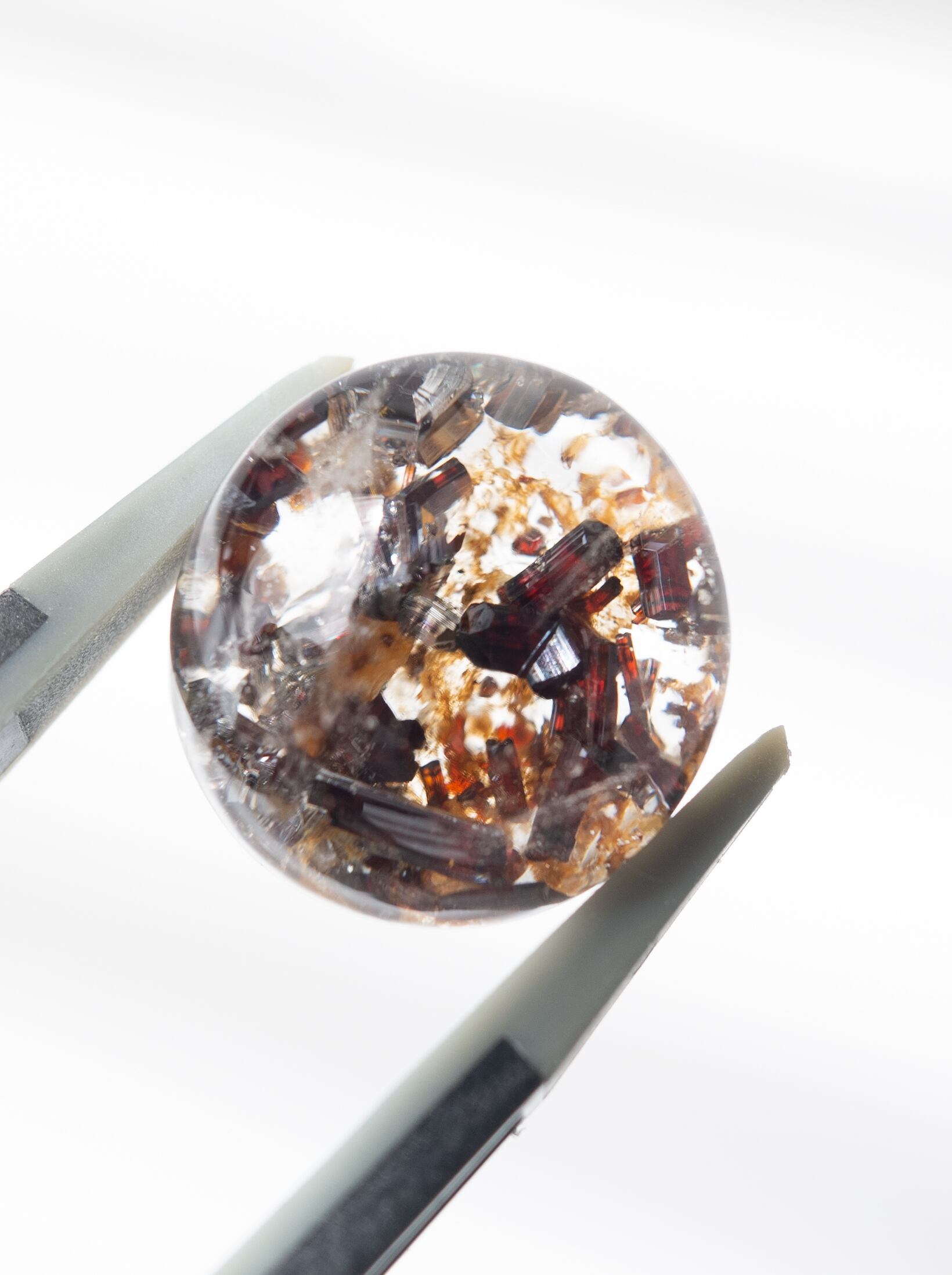 ルチルは酸化チタン鉱石で細い針のような形状が一般的ですが、こちらは同じ成分でありながら、赤黒い太くころんとした存在感のある結晶が入っている大変珍しいタイプです。