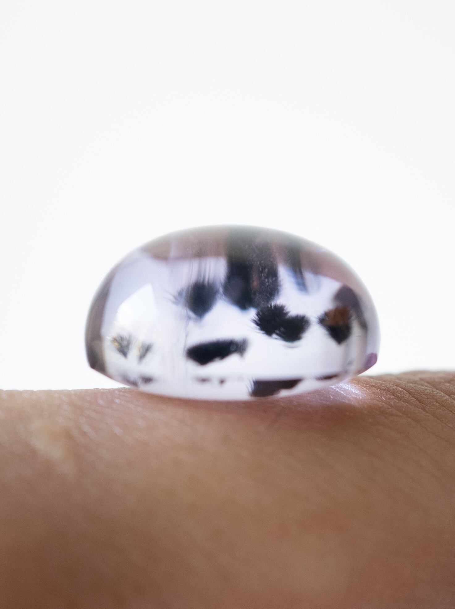 アメシストの中に、珍しいマンガン酸化鉱物であるロマネサイトを内包したものです。ロマネサイトは、アメシストの中に黒や灰色の模様や斑点として現れることが特徴で、アートのような美しいコントラストを楽しむことができます。